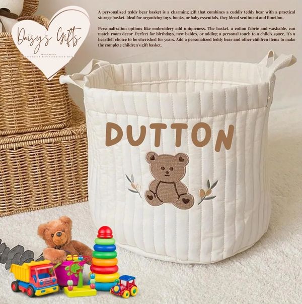 A personalized teddy bear basket is a charming gift that combines a cuddly teddy bear with a practical storage basket. Ideal for organizing toys, books, or baby essentials, they blend sentiment and function. Personalization like embroidery add uniqueness. The basket, a cotton fabric and washable, can match room decor. Perfect for birthdays, new babies, or adding a personal touch to a child's space, it's a heartfelt choice to be cherished for years. Add a personalized teddy bear and other children gift items to make the complete children’s gift basket.