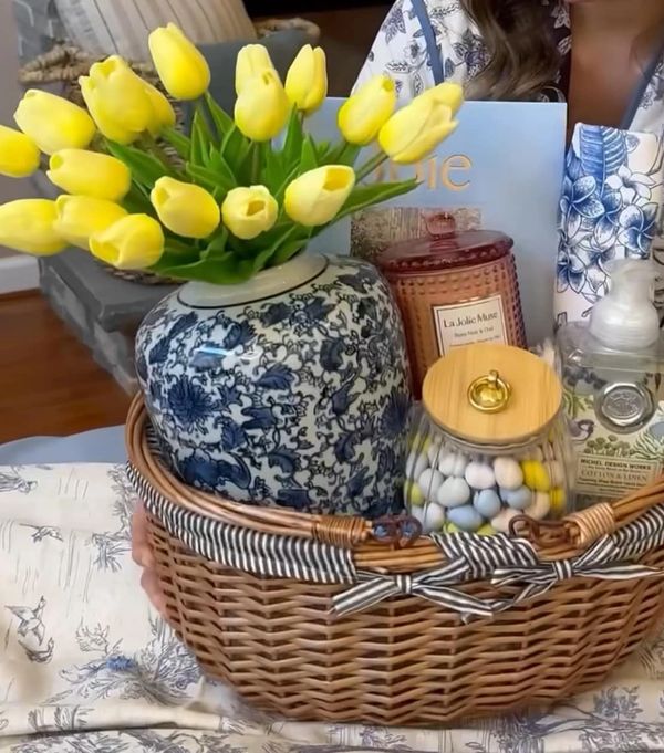 Add a little sunshine to someone's day with this unique gift basket. Includes blue and white vase with flowers (real or silk available) and more.