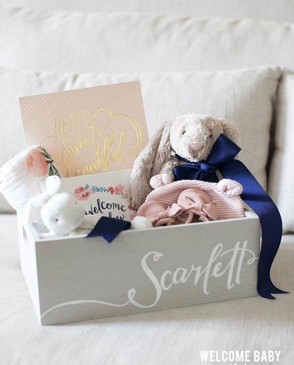 Shower the one you love with this New Baby Gift Box. Adding that special personalized touch on the box, baby blanket and bunny ear.
